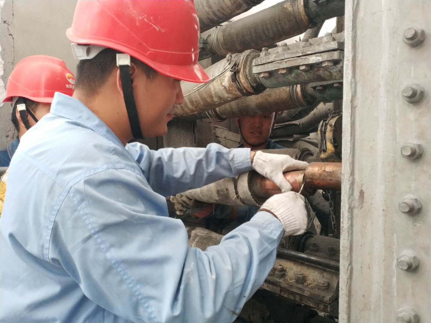 動力裝置員工正在檢修現場更換1#電石爐變壓器后方水冷補償器。