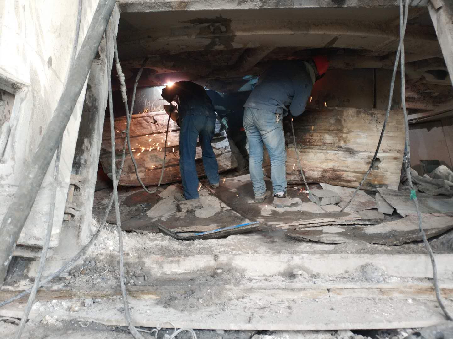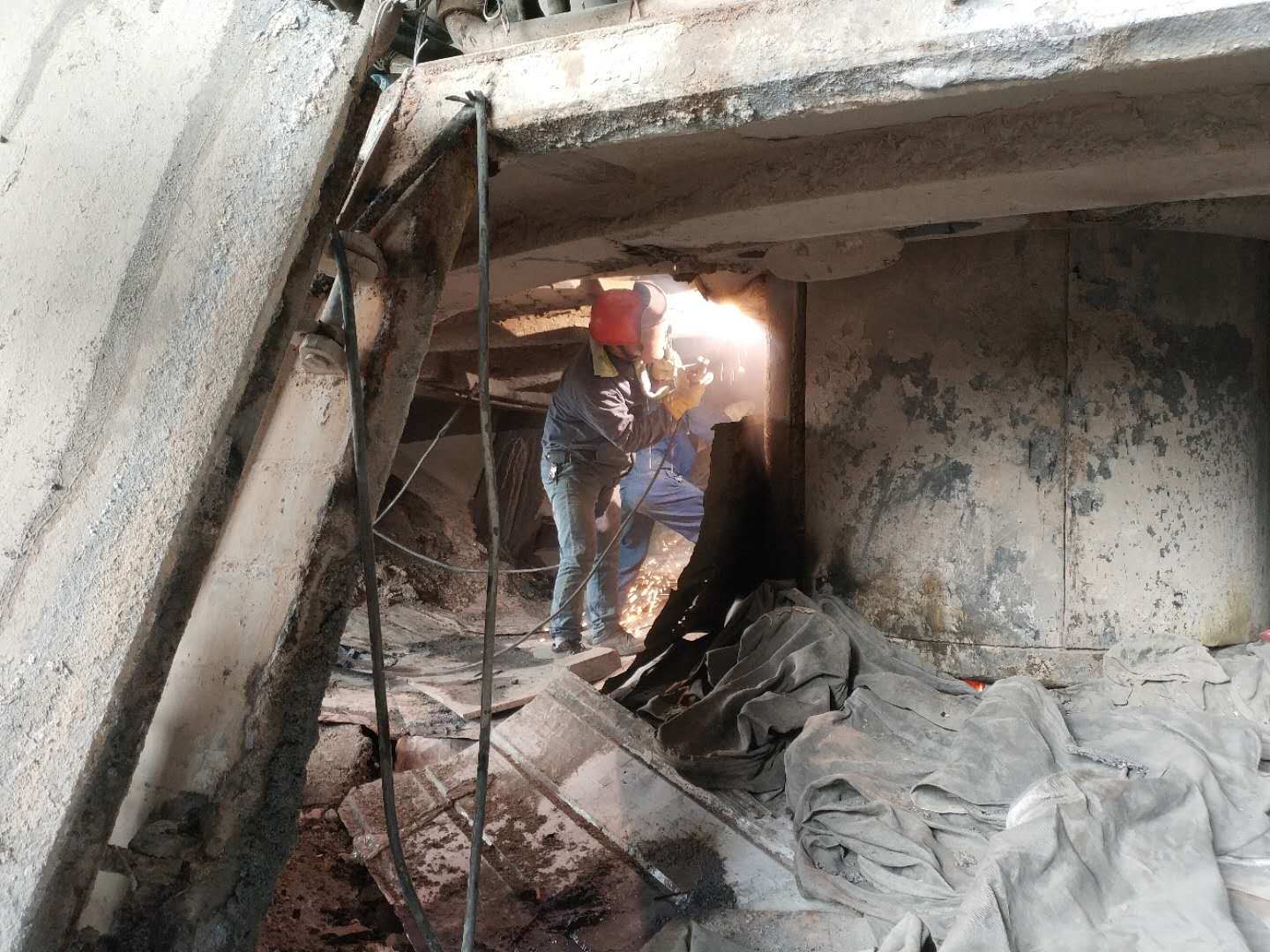 維修人員正頂著爐內高溫,對電極本體進行檢查,并修復爐內漏點。