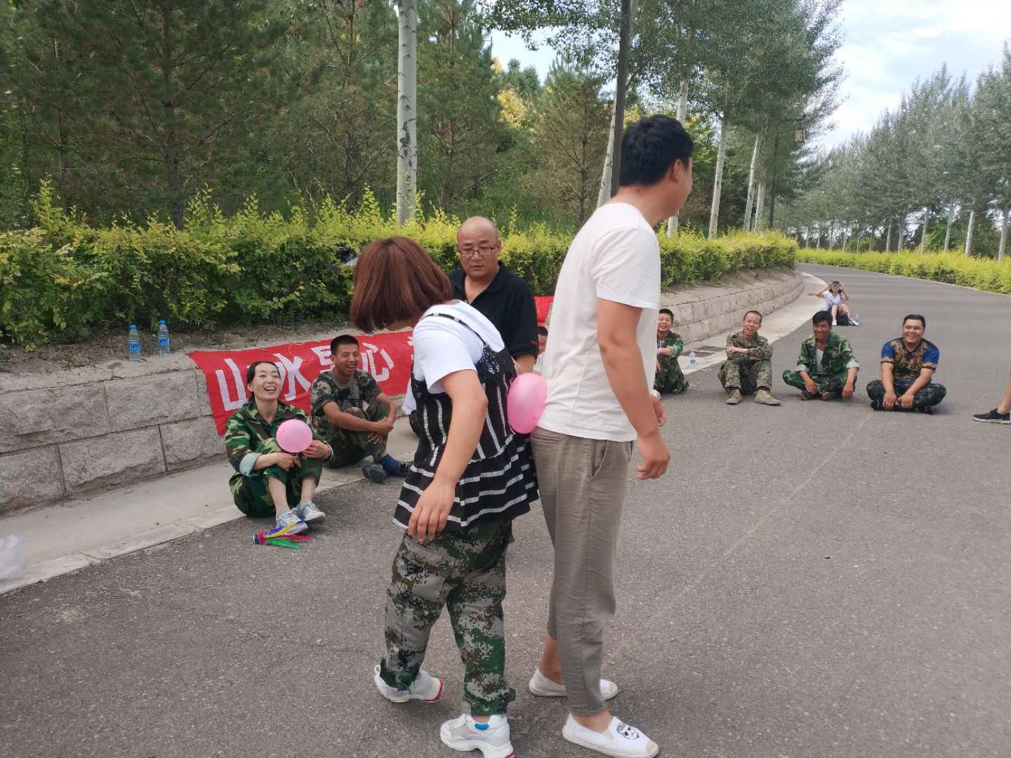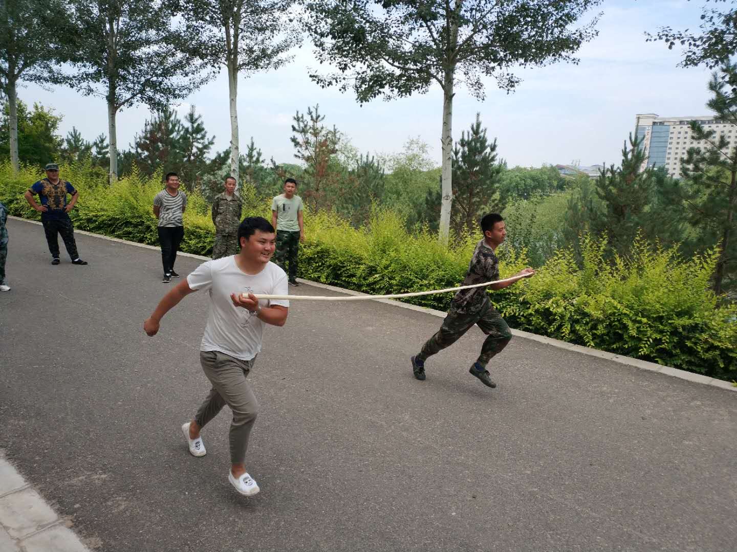 早上8點到黃河樓后,我們對18名新學(xué)員進行了分組,將隊員分成兩支隊伍,由隊長組織進行游戲。在隊長的帶領(lǐng)下,各隊隊員精誠合作,相互支持,先后進行了“跳繩比賽”、“個人跳繩比賽”、“斗牛比賽”“背對背運氣球比賽”“拔河比賽”、“俯臥撐比賽”等拓展項目。