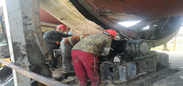 4月27日,此次回轉窯檢修已經迎來了最后的沖刺階段。工作中最頻繁,最臟的,最累的工作任務莫過于回轉窯大齒輪更換機油及校正工作。