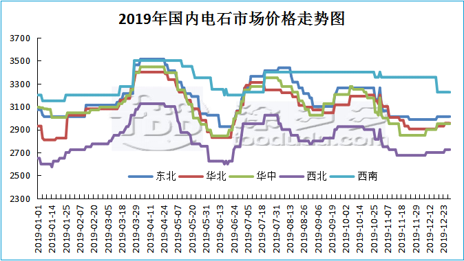 2019年中國國內電石走勢上半年跟隨PVC走勢類似,第一季度震蕩上行整理,4月份到達年度高點,但隨后價格開始下行,下行至6月中旬又開始震蕩上漲,隨后的三四季度震蕩走低中。整體來看作為PVC上游原料,電石的走勢類似于PVC走勢,但并不完全相同,尤其下半年,我們可以推測,下面的PVC收到資金以及市場炒作以及期貨方面的影響較大,并不是從供需、原料方面受到影響。