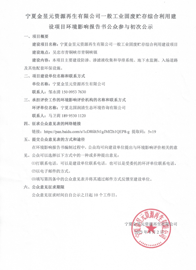 寧夏金昱元資源再生有限公司一般工業固廢貯存綜合利用建設項目環境影響報告書公眾參與初次公示