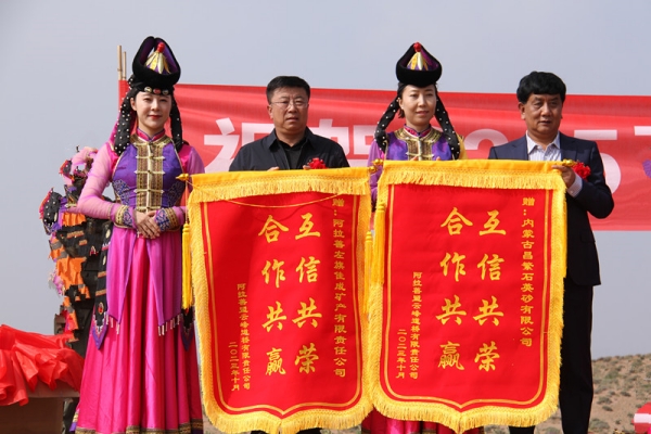 活動中,阿拉善盟云峰道橋有限責(zé)任公司為寧夏金昱元集團(tuán)公司等合作單位頒發(fā)旌旗。