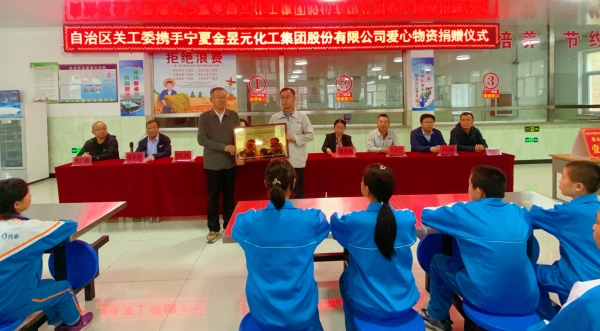 寧夏關心下一代工作委員會集金委主任、寧夏關心下一代基金會常務副理事長李作忠向寧夏金昱元化工集團股份有限公司頒授“愛心企業”牌匾。